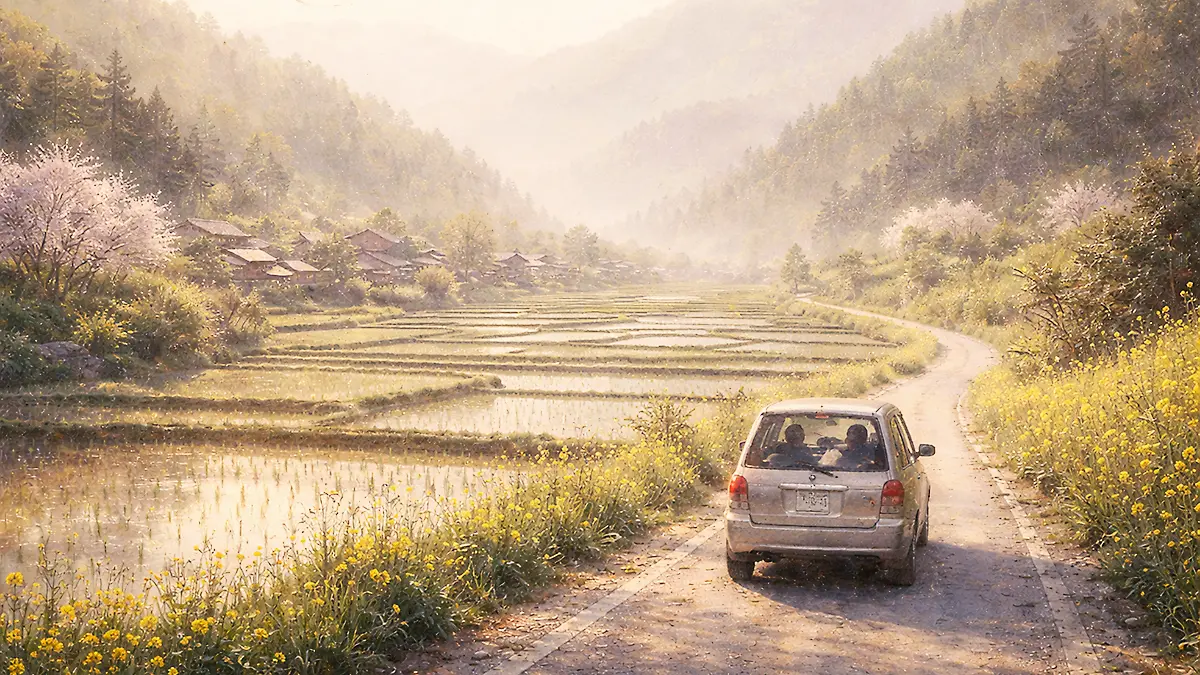 窓を開けると、山の空気が入ってきた。春の匂いがした。道端に菜の花が咲いている。田んぼには水が張られ始めていて、空を映してきらきら光っていた。