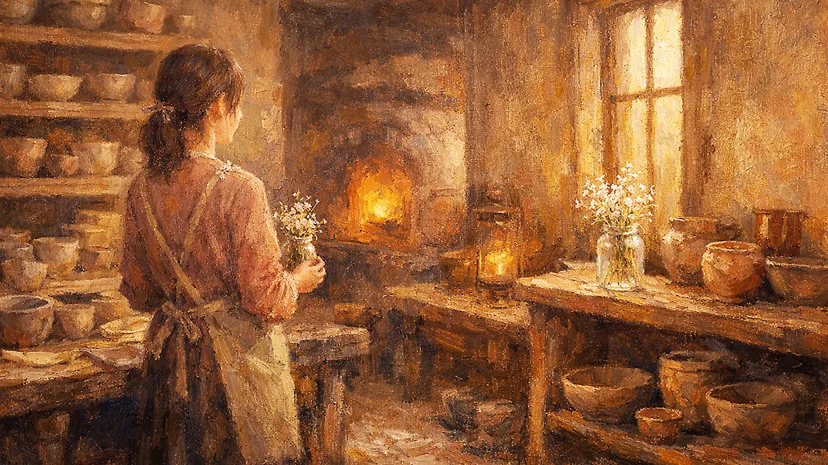 夕暮れの光が工房の中に差し込んで、干し花の影が壁に伸びた。
