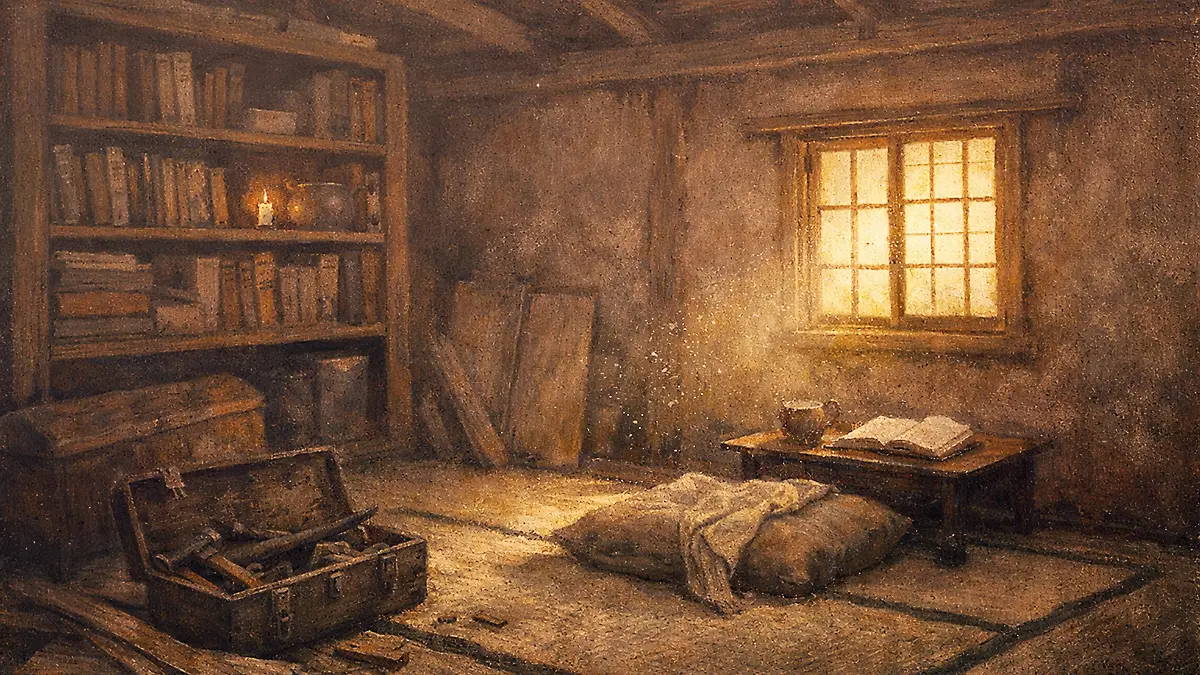 中は、薄暗かった。電球がひとつ、細い光を垂らしていた。倉庫だった場所の一角が、きれいに片付けられていた。板の壁に断熱材が貼られ、小さな窓がひとつ作られていた。窓枠は既製品ではなく、木を切り出して作ったものだ。荒削りだが、丁寧に磨かれている。床には古い絨毯が敷かれ、端の方に小さなプラスチックの収納箱がひとつ。