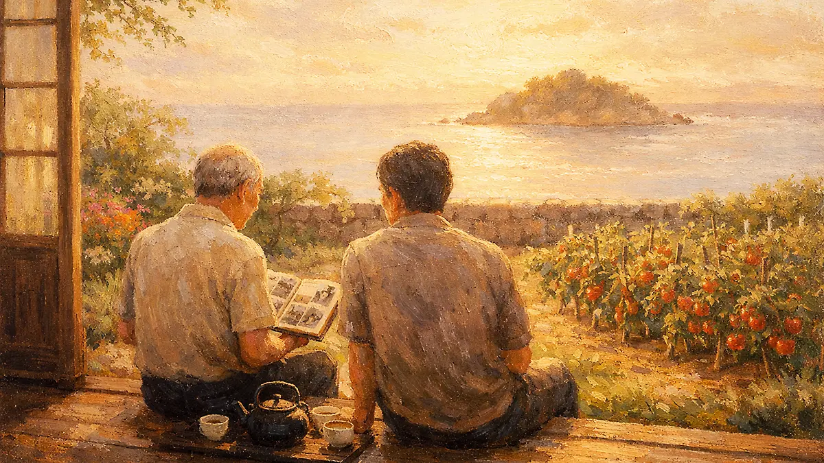先生は黙って頷き、お茶を一口飲んだ。窓の外で、夕暮れの海がゆっくりと色を変えていた。