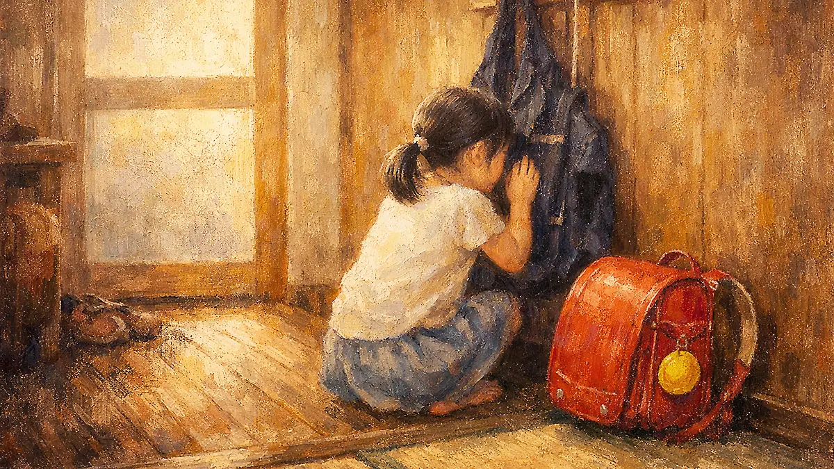 赤いランドセルは、玄関の壁に立てかけてあった。