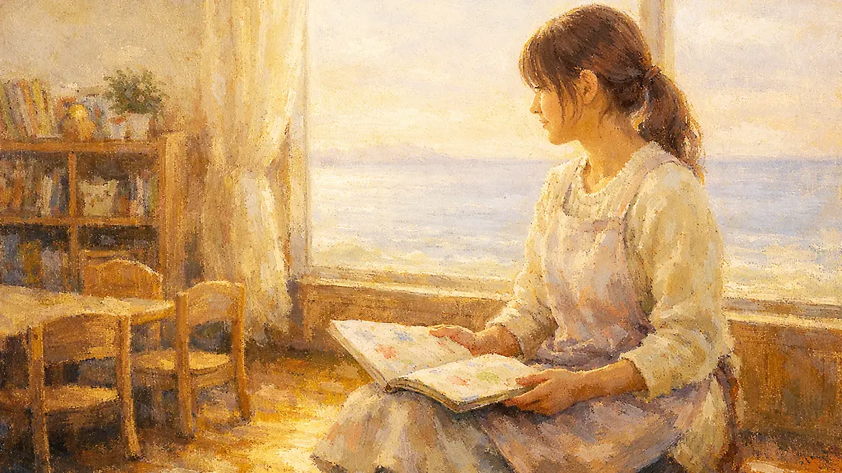ページをめくるたびに、見覚えのある風景が続いた。朝の会の輪、砂場、廊下の窓から見た運動場。どのページにも、必ずエプロンの人が一人、隅のほうにいた。わたしだった。