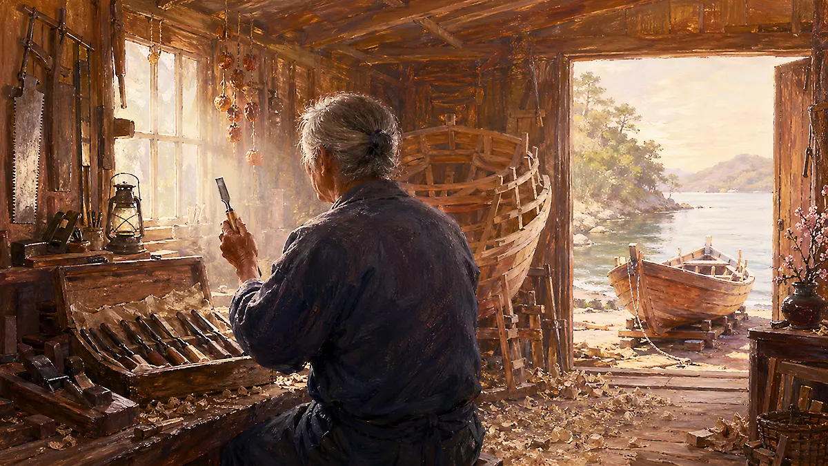 壁には親父の代から使っている鋸や鉋がずらりと並び、奥には進水を待つ和船の骨組みが影のように立ち上がっていた。